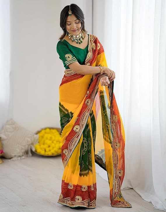 | Name : | PIYU P1030 mor bandhani Yellow-Green Saree |